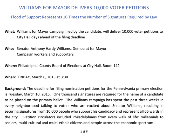 So if you’re running for mayor and you need 1,000 signatures, you’re running for a citywide office. That means your supporters aren’t limited to a specific area like, say, 9th District Council. But the signatures do need to belong to people who are registered with the party for which you’ve declared candidacy. Signatures need to be accompanied by the printed name, address and date of signature.